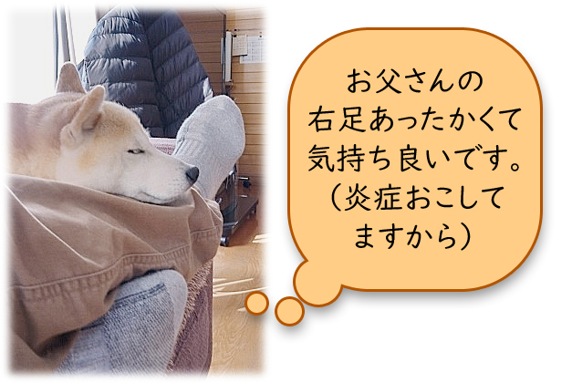 近代医学は進歩している。医者の言う通りになった。医者はやはりエライ、神様だ。 痛風は風に当たっても痛いと言うが、炎症を起こしている足には心地よい風だ。 こうなると犬の散歩に行きたくなるし、犬も散歩の誘いに来るので無理して散歩に出かけたのが失敗だった。散歩の途中で足が痛くなって帰宅した。 犬は中途半端な散歩に機嫌が悪く、妻に散歩の延長を催促している。 足の腫れがひいて、靴が普通にはける状態になった。(ここから1箇月間禁酒した) あの激痛を思い出すと禁酒は絶対にできる。妻は言った「アル中で無いのが証明できてよかったねっ!」何も言い返せない自分が情けないと思った。 女性に痛風患者がいないのは不思議だが、女性には外反母趾があるので五分五分かな。 普段はあまりそばに寄ってこない犬が、安静にしていると何故かくっついてくるのが不思議だ。気軽に右足にアゴのせしないでほしい。まだ少し痛いんです。 つづく